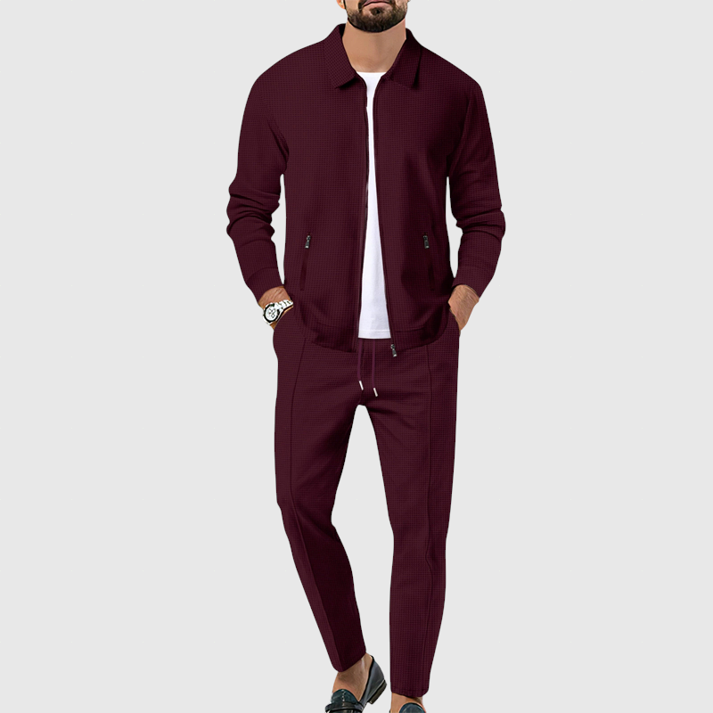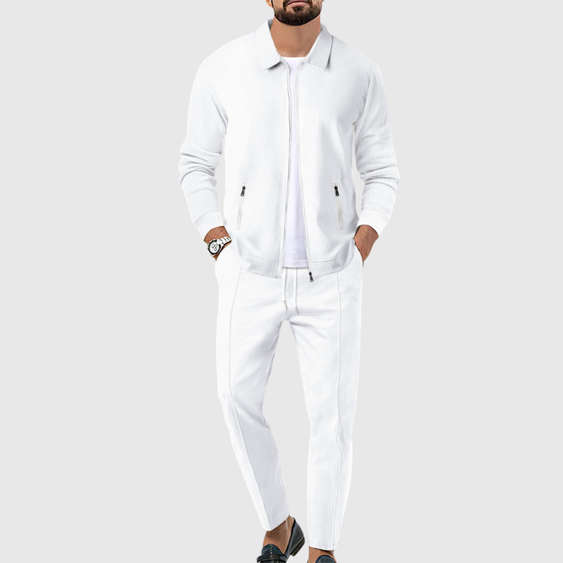 Tento stylový pánský volnočasový komplet nabízí dokonalou kombinaci elegance a pohodlí. Kvalitní, měkký materiál zajišťuje výjimečný komfort při nošení. Bunda se zipem a elastický pas u kalhot poskytují ideální střih. Ať už pro pohodové dny doma, sportovní aktivity nebo neformální výlety, tento komplet vám vždy zajistí upravený a moderní vzhled.