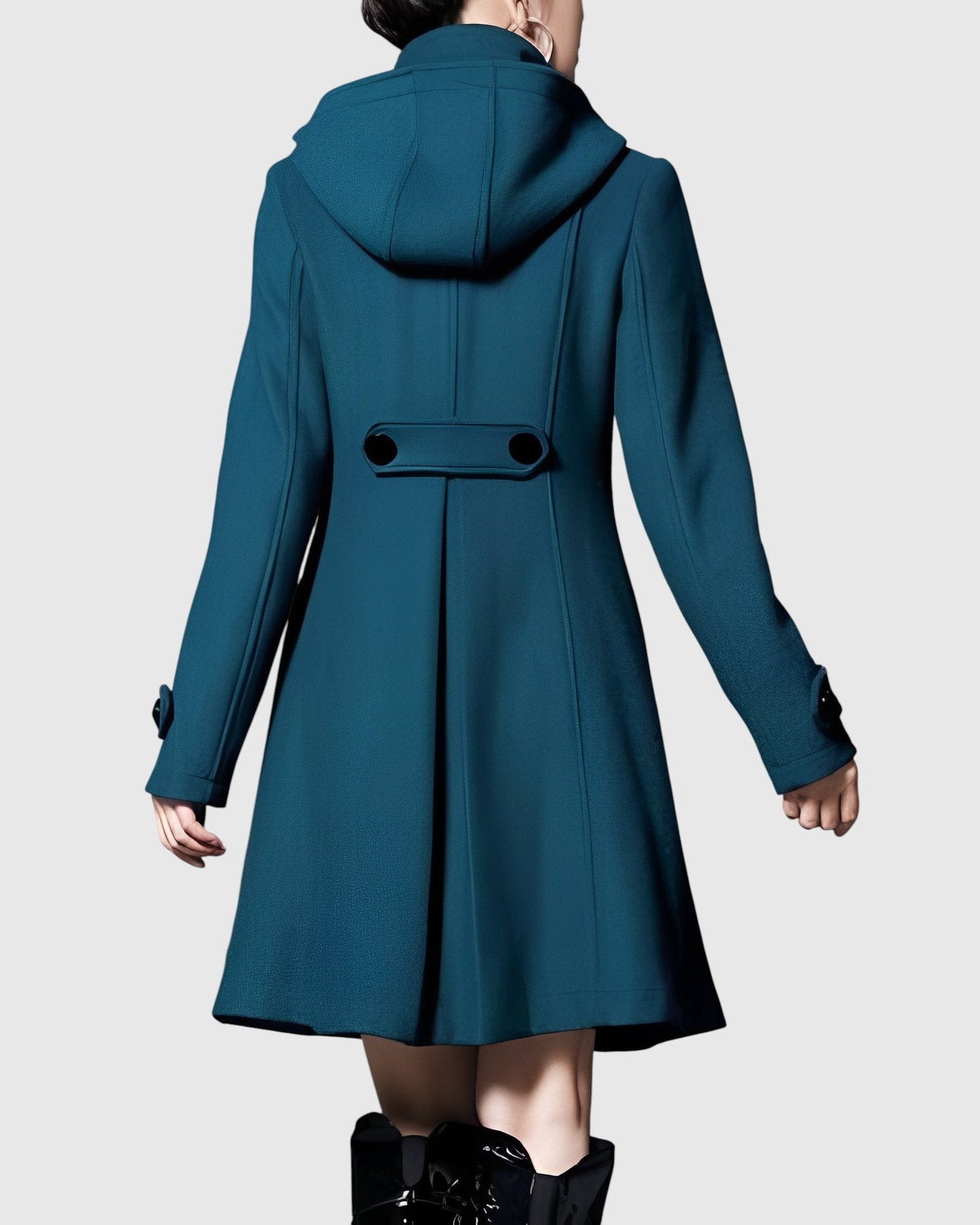 Dámský kabát s rozšířeným (A-line) střihem, vysokým límcem a nastavitelnou kapucí. Vpředu dvouřadé zapínání a praktické kapsy s patkami. Pevnější, měkká tkanina drží tvar bez zbytečné hmotnosti, střední délka opticky prodlužuje siluetu. Manžety s ozdobným páskem, precizní zpracování a pohodlná podšívka. Univerzální volba do města, do práce i na víkend — skvěle ladí se šaty, sukněmi i džíny a vynikne s kozačkami.