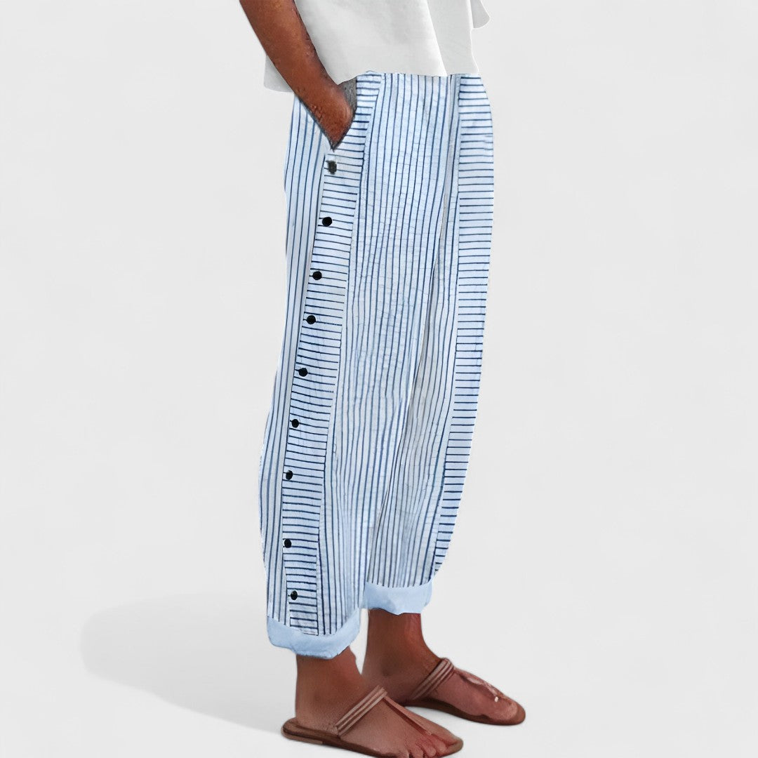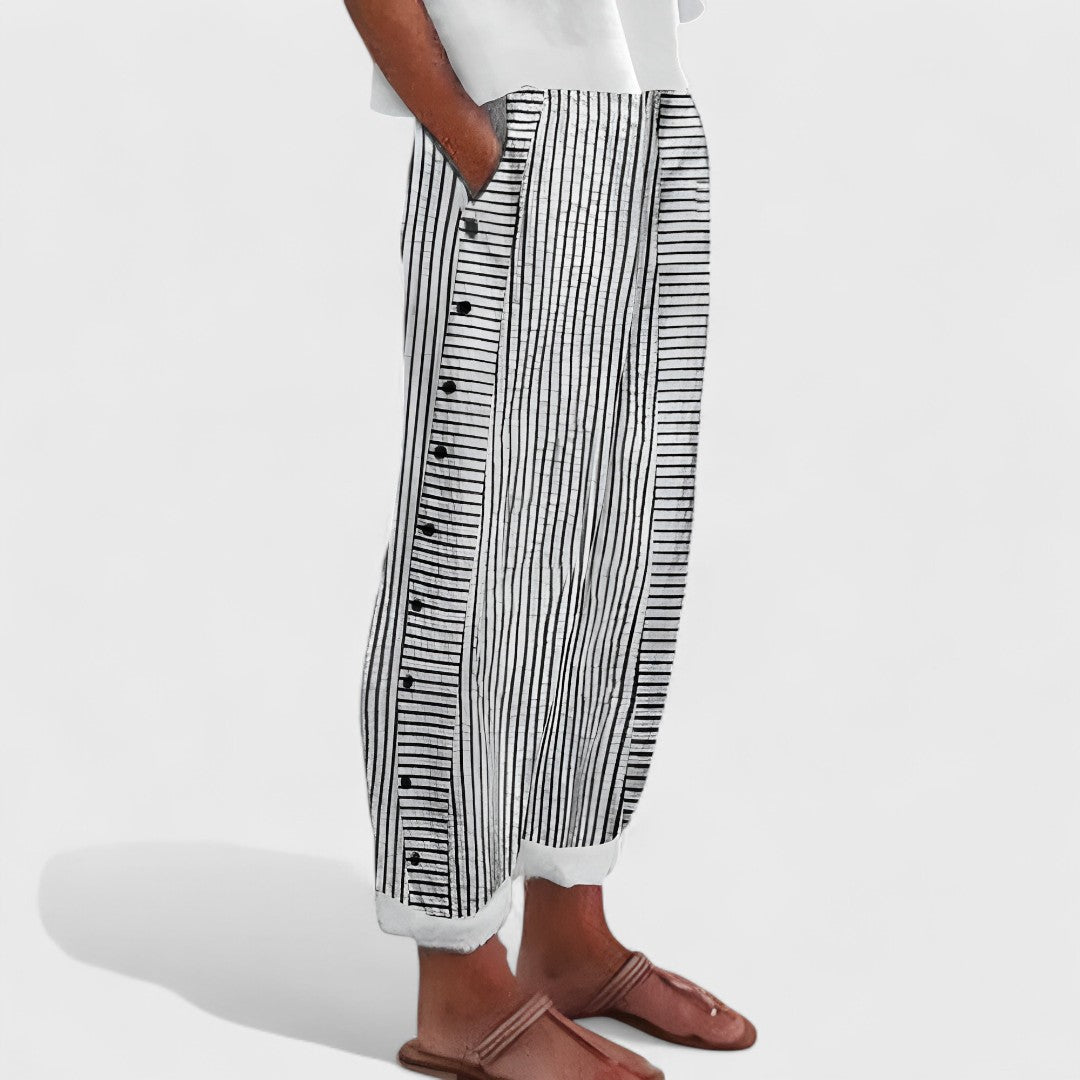Kalhoty Věra jsou vyrobené z jemného lnu, který přirozeně chladí a dýchá. Díky volnému střihu a elastickému pasu nabízejí pohodlí, ale zároveň vypadají upraveně – ideální na procházky, večerní setkání nebo dny, kdy chcete vypadat stylově a zároveň se cítit dobře.