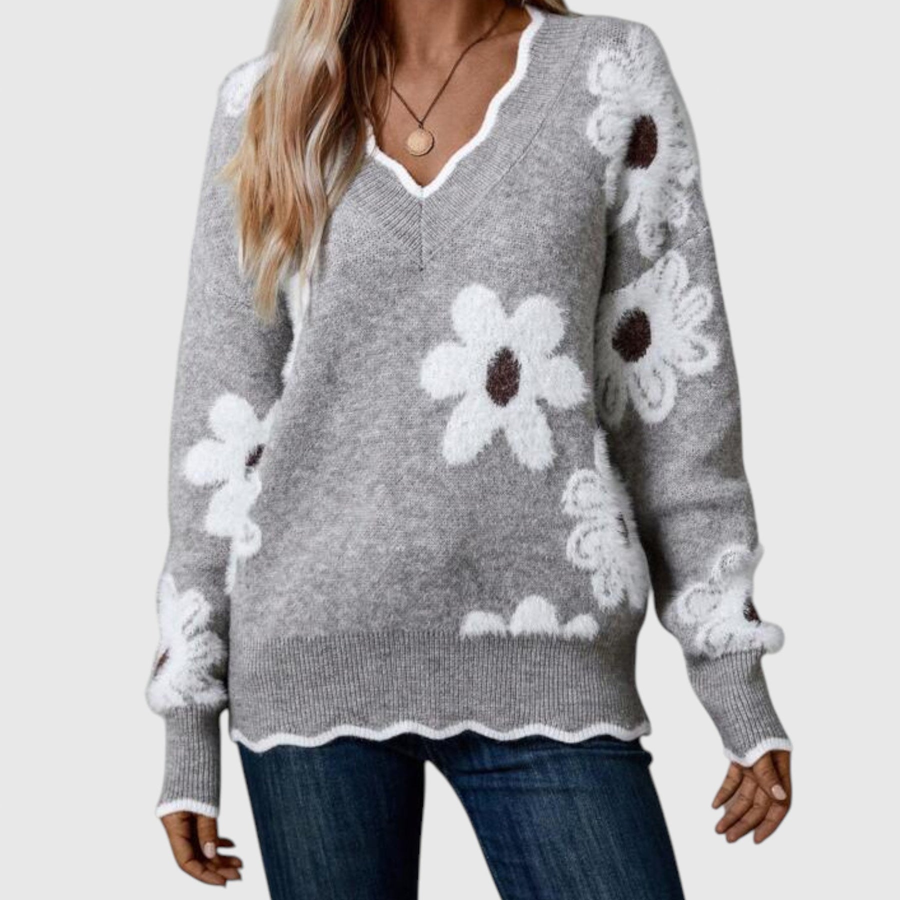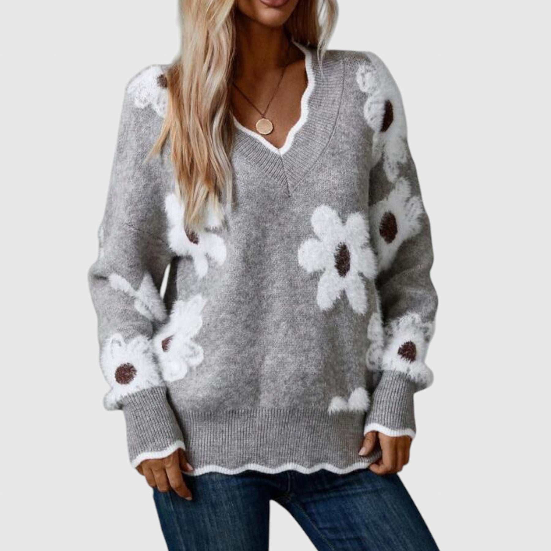 THEA - Elegantní V-svetr s květinami