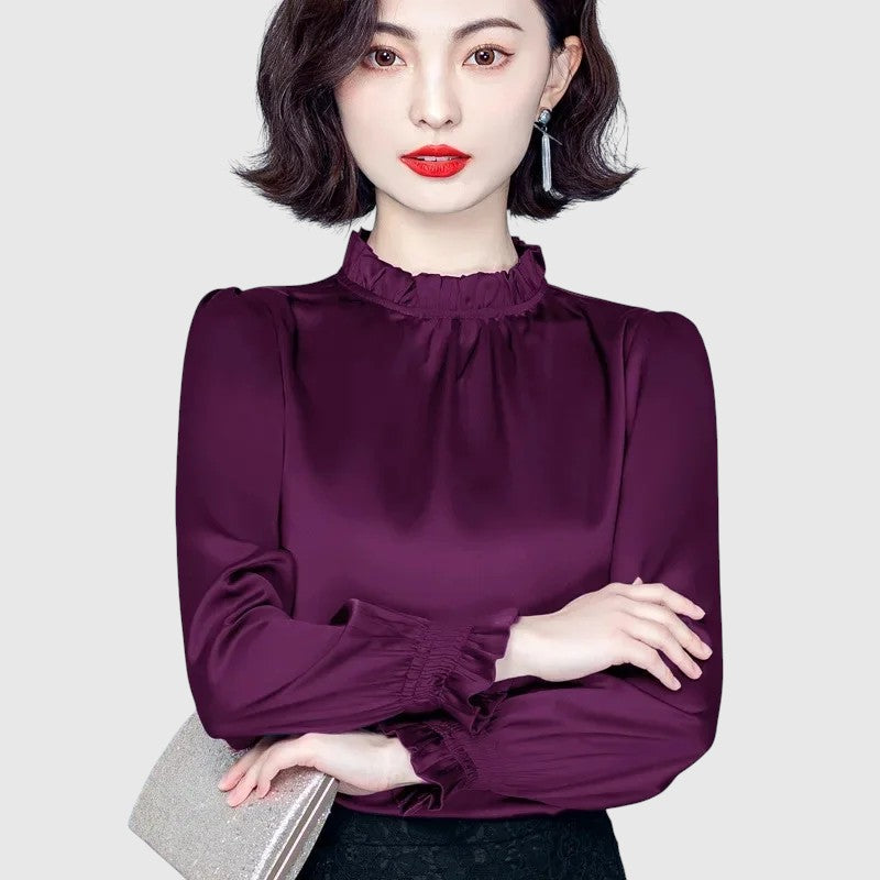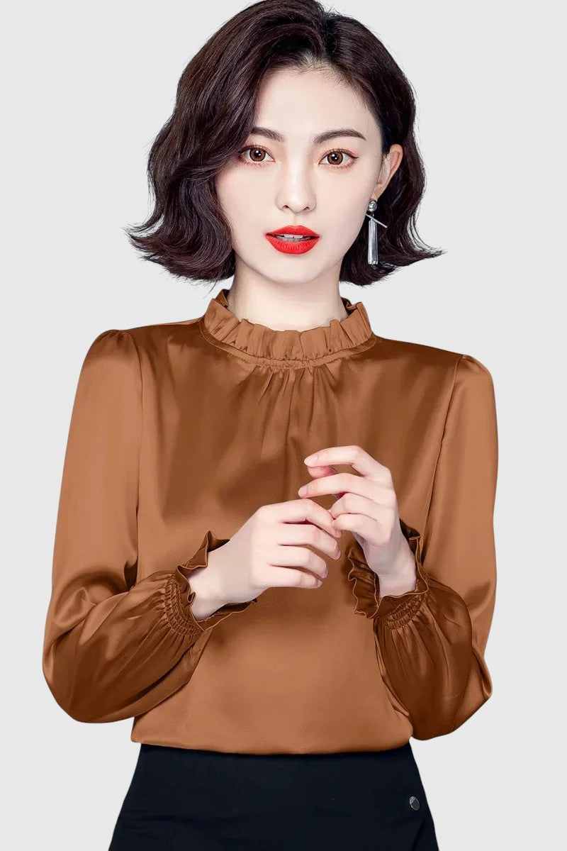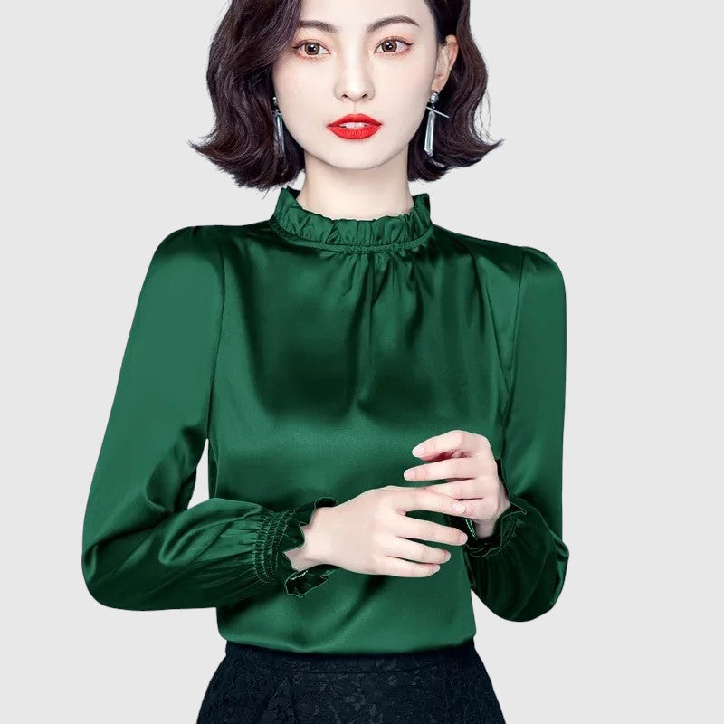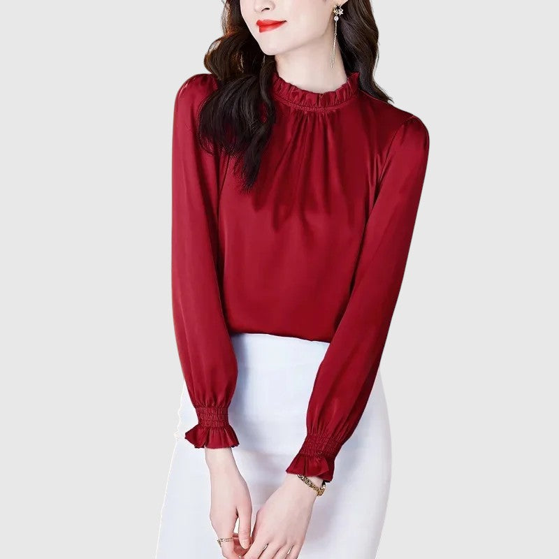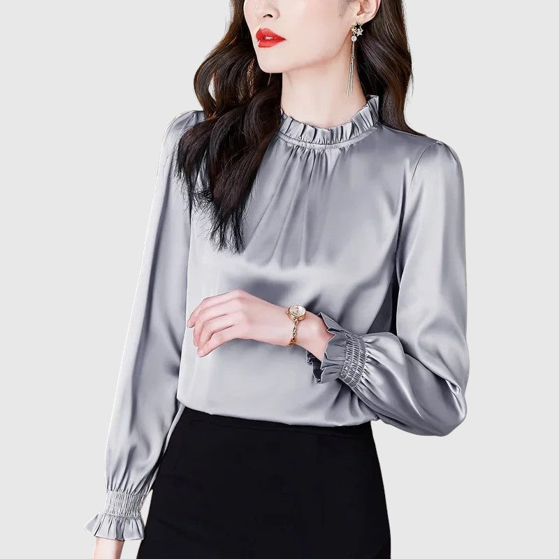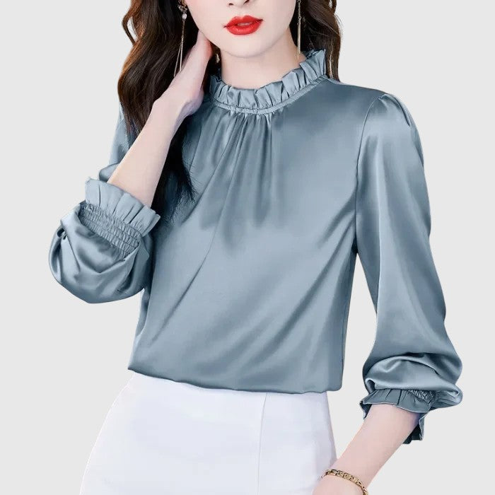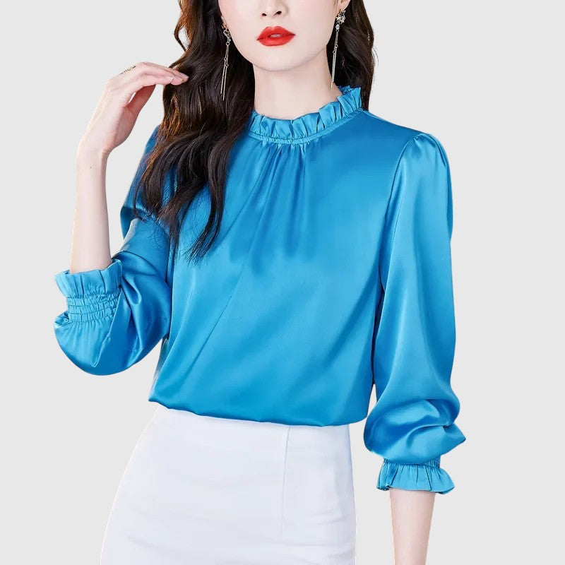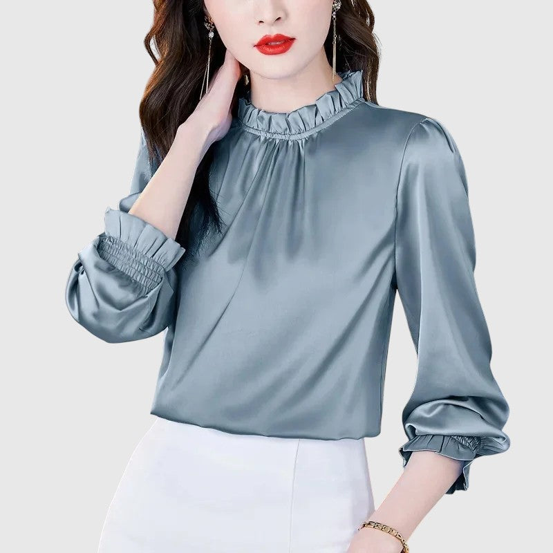 • Řasené detaily na límci a manžetách, které dodávají romantický a rafinovaný nádech.